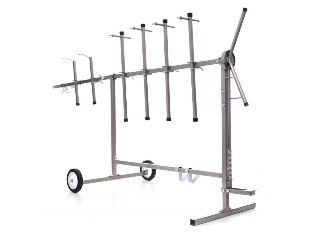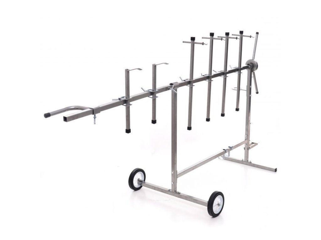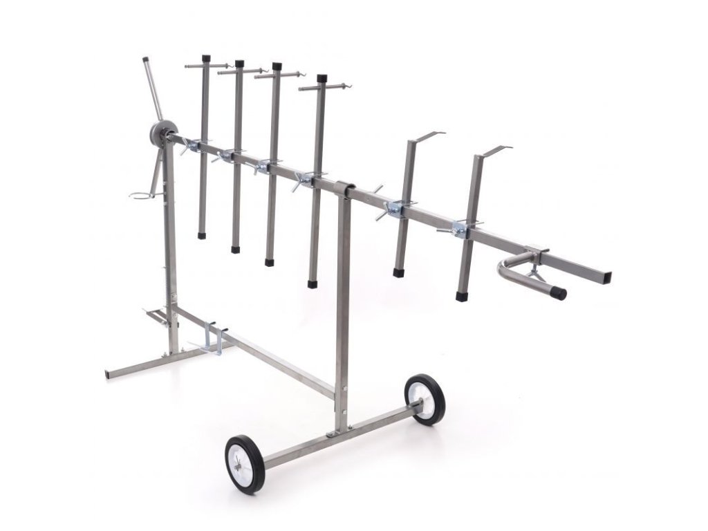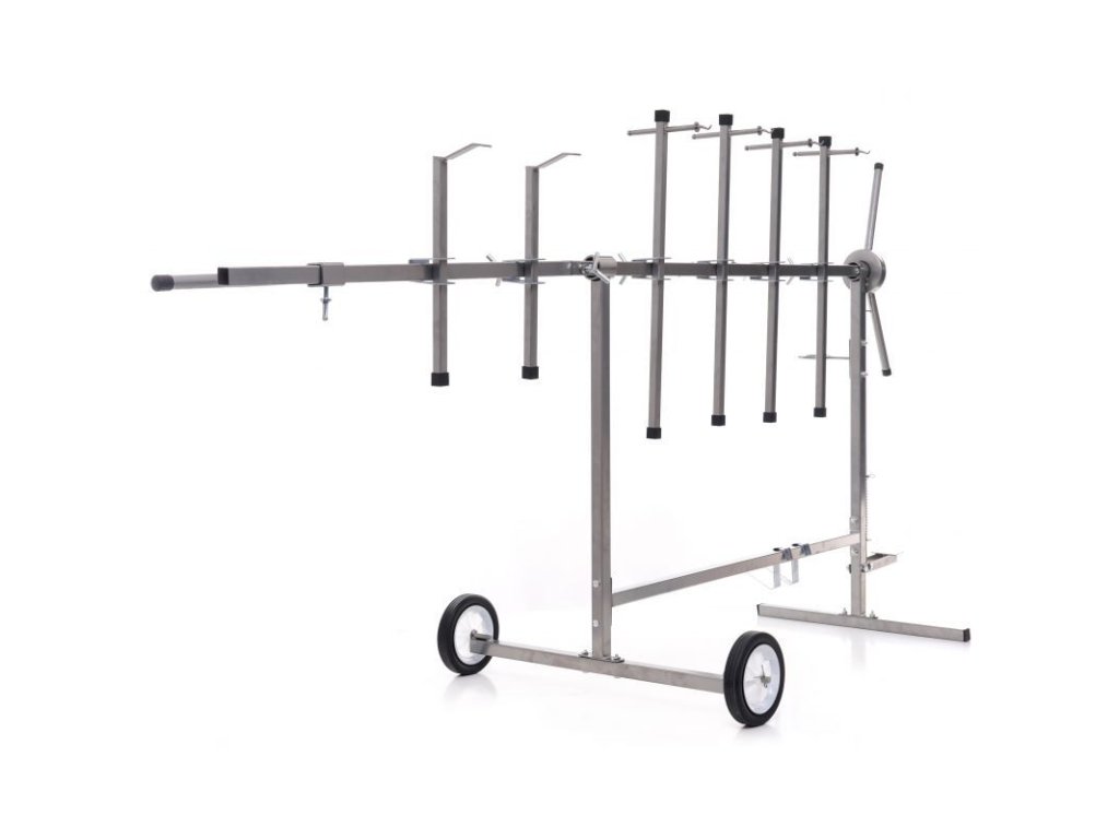Stojan otočný na lakování pro stabilní upevnění lakovaných prvků v libovolném úhlu. Má šest ramen s dvojitým upevňovacím systémem a dvěma kratšími konci s hákem. Konstrukce je pevná a stabilní díky spojování dílů pomocí průběžných svarů. Stojan je vybaven gumovými kolečky, která umožňují volný pohyb. Kola jsou pokryta nátěrem odolným vůči chemikáliím. Všechni části ramen lze libovlně nastavit a posouvat díky aretačním šroubům. Stojan má přidavný zadní díl, kterým lze stojan prodloužit a tím zvětšit jeho pracovní plochu. Stojan má otočný mechnaismus s nožní aretací, lze tak libovolně pomocí rukojeti otáčet lakovací předměty bez nutnosti se jich jakoliv dotknou a nebo manipulovat. Vybaven praktickým držákem pro stříkací pistoli.
