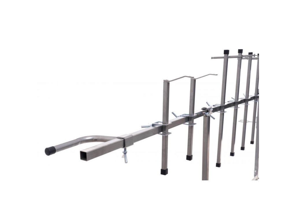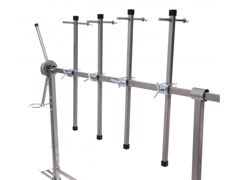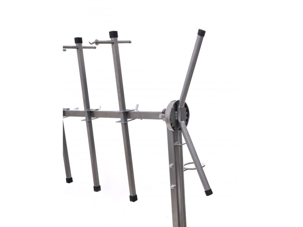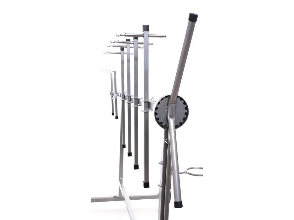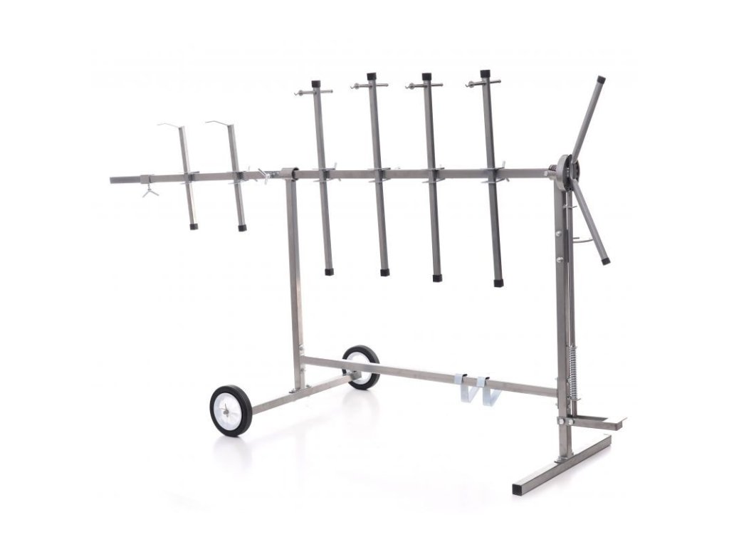 Stojan otočný na lakování pro stabilní upevnění lakovaných prvků v libovolném úhlu. Má šest ramen s dvojitým upevňovacím systémem a dvěma kratšími konci s hákem. Konstrukce je pevná a stabilní díky spojování dílů pomocí průběžných svarů. Stojan je vybaven gumovými kolečky, která umožňují volný pohyb. Kola jsou pokryta nátěrem odolným vůči chemikáliím. Všechni části ramen lze libovlně nastavit a posouvat díky aretačním šroubům. Stojan má přidavný zadní díl, kterým lze stojan prodloužit a tím zvětšit jeho pracovní plochu. Stojan má otočný mechnaismus s nožní aretací, lze tak libovolně pomocí rukojeti otáčet lakovací předměty bez nutnosti se jich jakoliv dotknou a nebo manipulovat. Vybaven praktickým držákem pro stříkací pistoli.