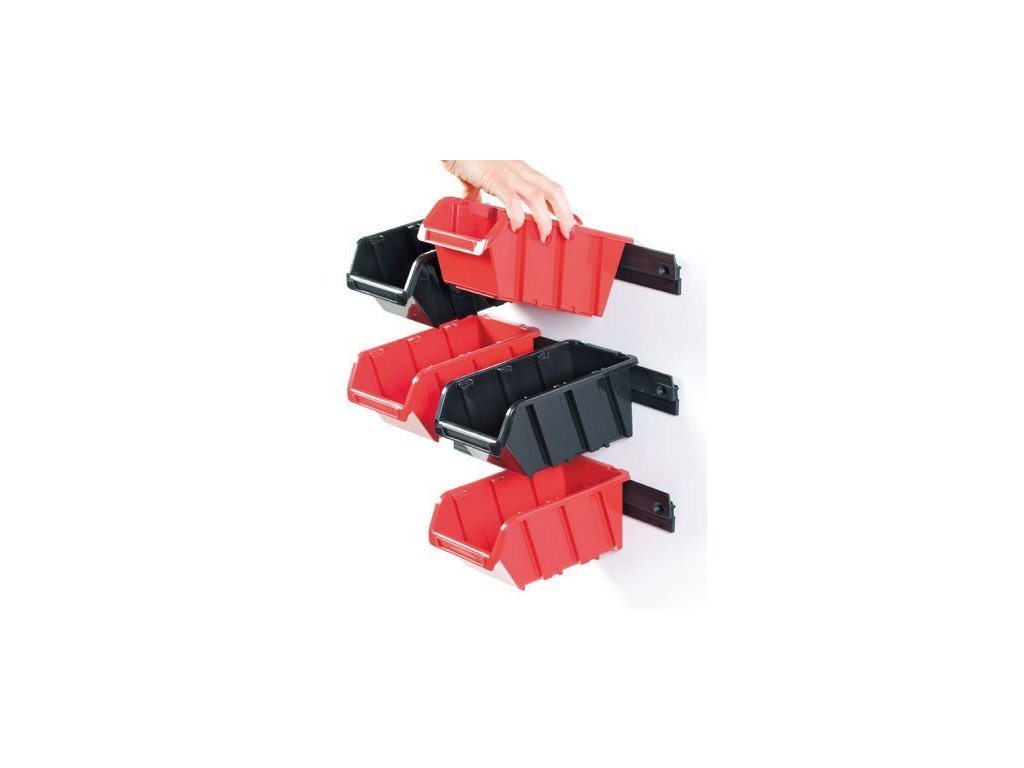 Plastové úložné boxy s háčky Vám pomohou snadno, přehledně a rychle uspořádat veškerý materiál jako je např. spojovací materiál, drobné nářadí čí jiné menší věci tak, že vše budete mít přehledné, rychle dostupné a zároveň ušetříte místo v dílně nebo garáži. Boxy jsou vyrobeny z kvalitního plastu a je možné je připevnit na stěnu pomocí lišty (není součást balení).